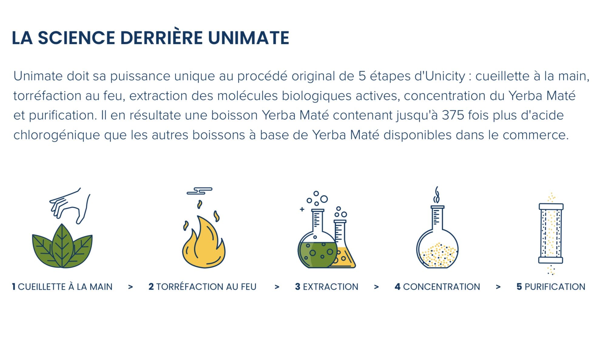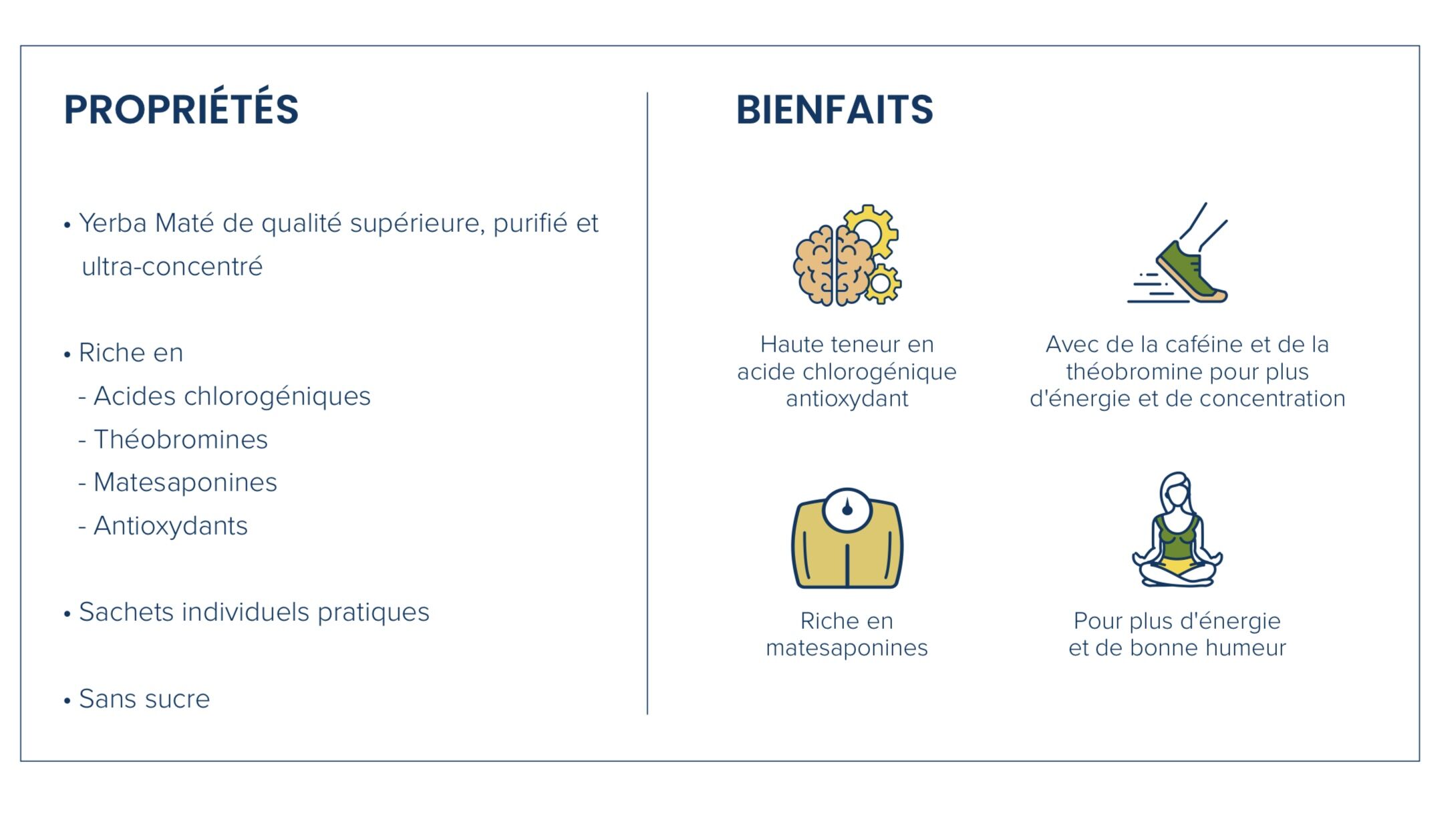 • Extrait de yerba maté hautement concentré : Issu d’un procédé exclusif en cinq étapes (récolte manuelle, torréfaction au feu, extraction, concentration et purification), cet extrait est riche en acides chlorogéniques (jusqu’à 375 fois plus que le maté standard), caféine naturelle, théobromine et matesaponines .
