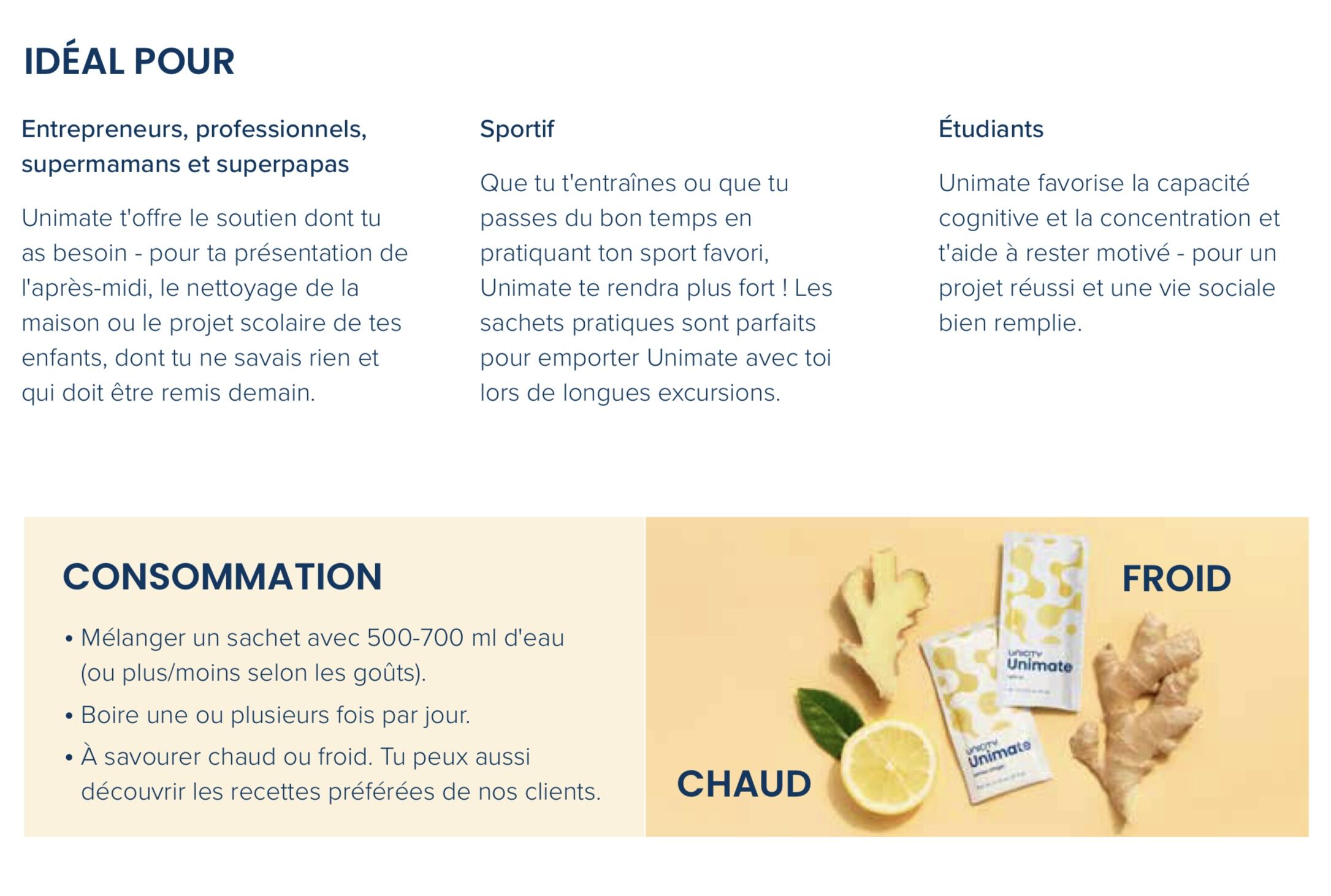 Unimate Citron Gingembre d’Unicity est idéal pour ceux qui recherchent une alternative naturelle au café, souhaitant améliorer leur clarté mentale, leur humeur et leur énergie tout au long de la journée.