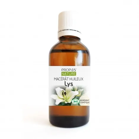 Macérât huileux Bio de Lys (Lilium candidum), 100% naturelle, première pression à froid, sans aucun traitement chimique. Qualité alimentaire. Macération des fleurs fraîches de Lys dans de l’huile de Tournesol désodorisée biologique puis filtration. Principaux acides gras essentiels :
